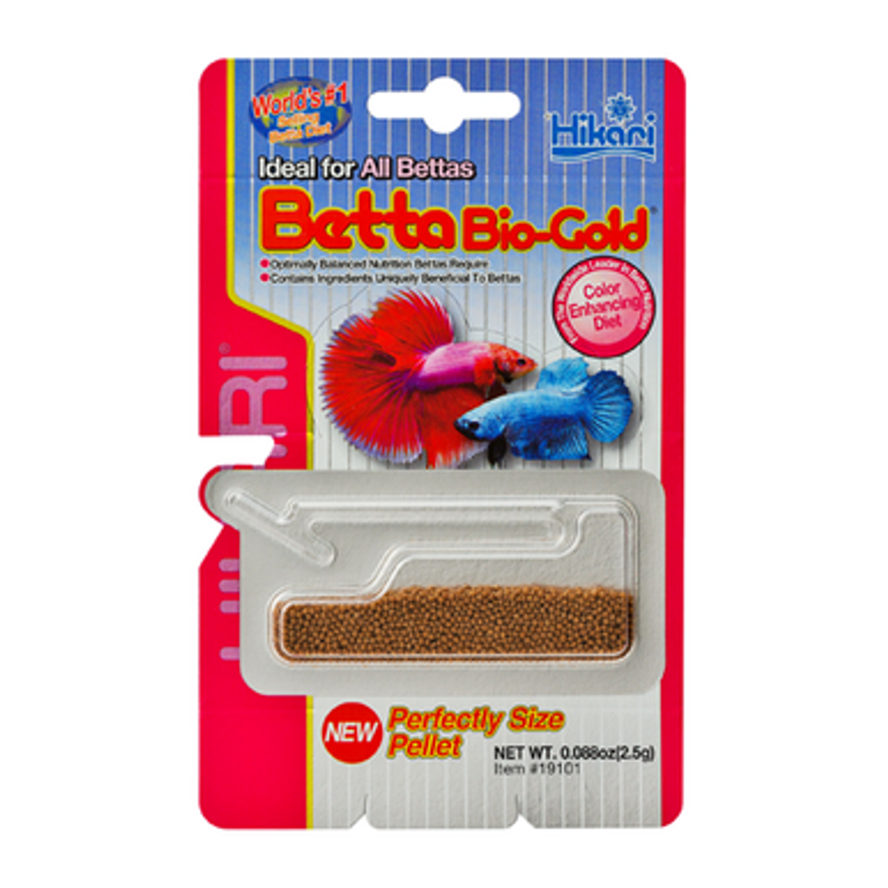 Hikari Betta Bio-Gold is a 2.5g specialized fish food for all Betta types. Its color-enhancing, perfectly sized pellets provide optimally balanced nutrition for your fish’s health and vibrancy.