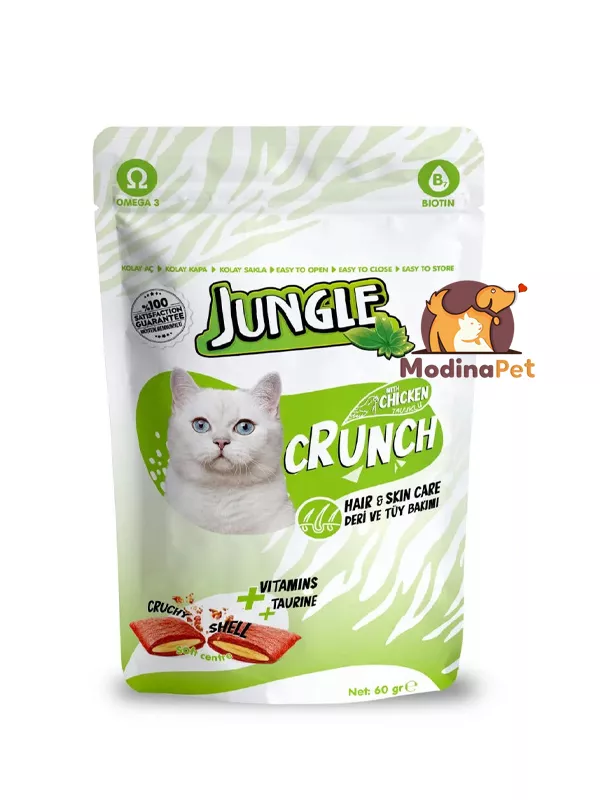 Jungle Crunch Skin & Coat Care Chicken Cat Treat is specially formulated to support healthy skin and beautiful shiny fur in cats. It is suitable for adult cats and kittens over 8 weeks of age.