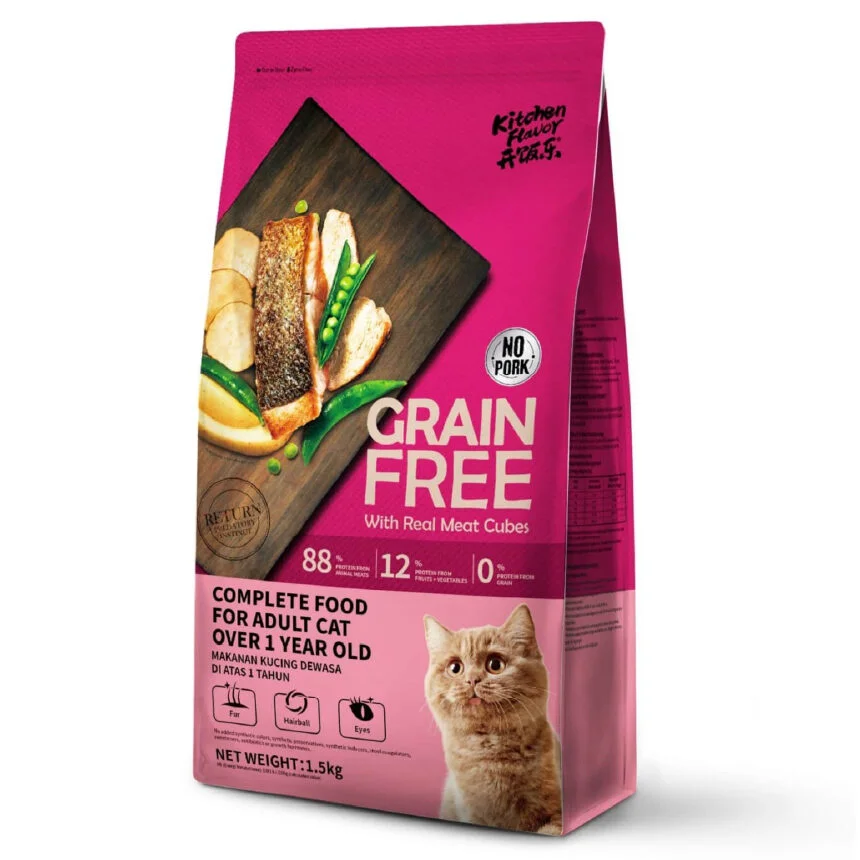 Nourish your adult cat with Kitchen Flavour Grain Free Complete Adult Cat Food 1.5KG. Promotes beautiful coat, healthy digestion & vitality. Made with real meat, no pork.