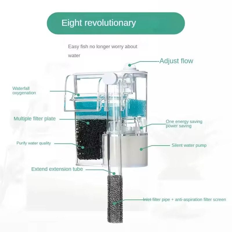 The Nepall Mini Filter-2.5W (250L) is an energy-efficient and quiet aquarium filter with multiple stages of filtration, adjustable flow, and a waterfall oxygenation feature.