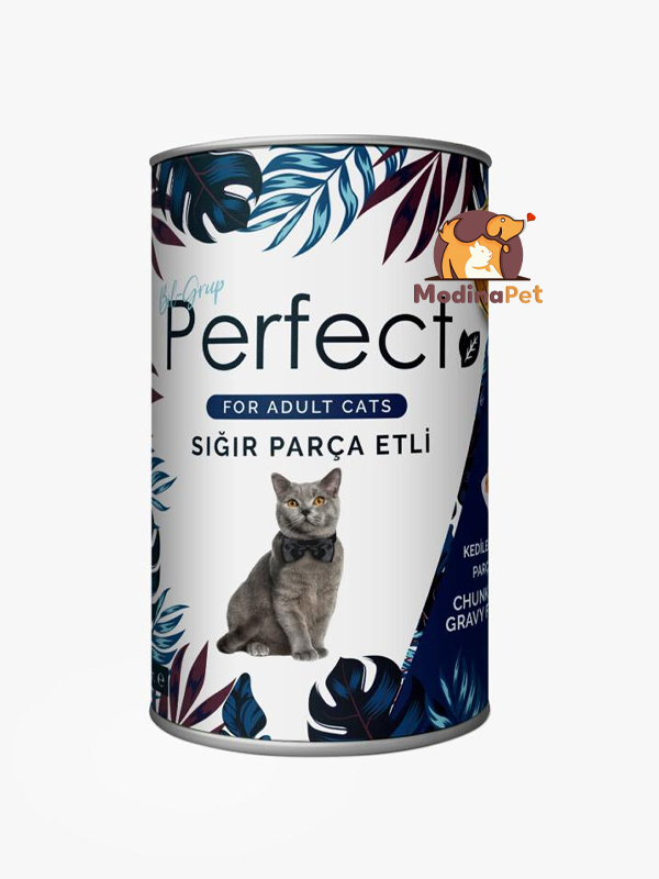 Perfect Beef Chunks in Gravy Adult Cat Wet Food 400 gm is a complete and balanced wet food for adult cats. Made in Turkey by Bilgrup, this tasty beef-based cat food comes with soft meat chunks in rich gravy to support daily nutrition, digestion, and hydration.