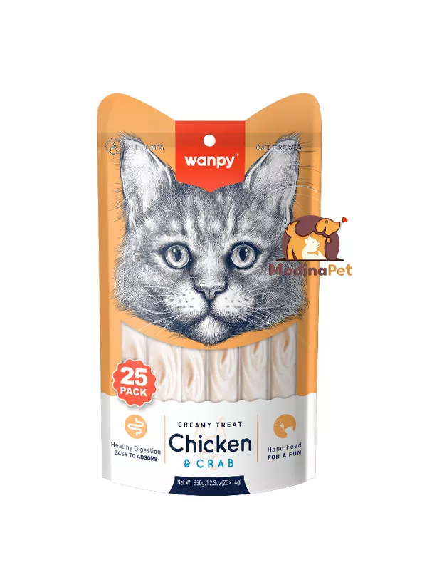 Wanpy Creamy Cat Treat Chicken & Crab Flavour 25 Pack is a premium creamy snack specially crafted for cats who love rich meat and seafood flavors. Made with high-quality chicken and delicious crab taste, this treat delivers excellent nutrition along with irresistible flavor.